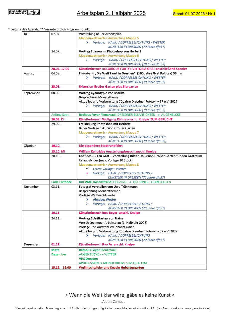 Die 57 steht für das Gründungsjahr des Fotovereins, der bis heute besteht. Unsere Klubabende finden vierzehntägig montags 18:00 Uhr statt. In diesen stellen wir unsere Bilder vor, diskutieren die
